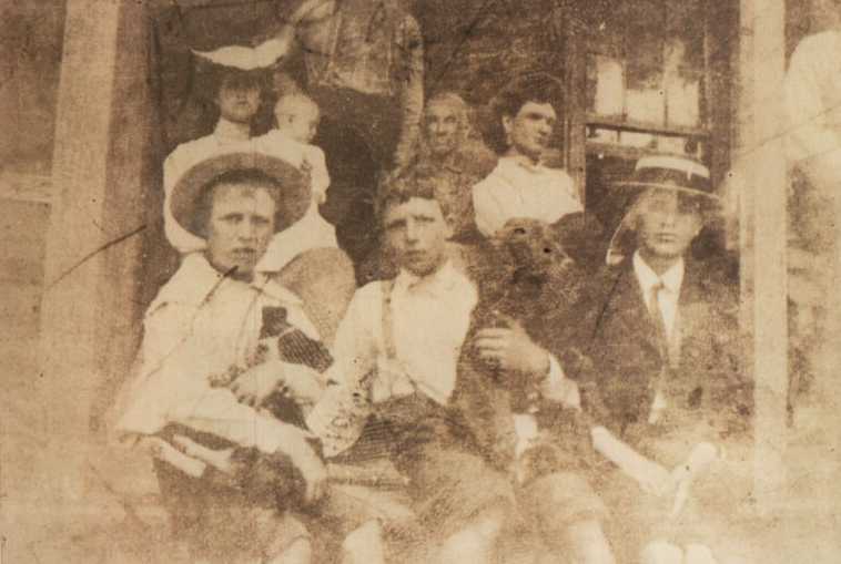 Jonah Jefferson Sexton (front left) with his dog on the front porch of his Grandfather John Pierson Eden's house (ca. 1898). |